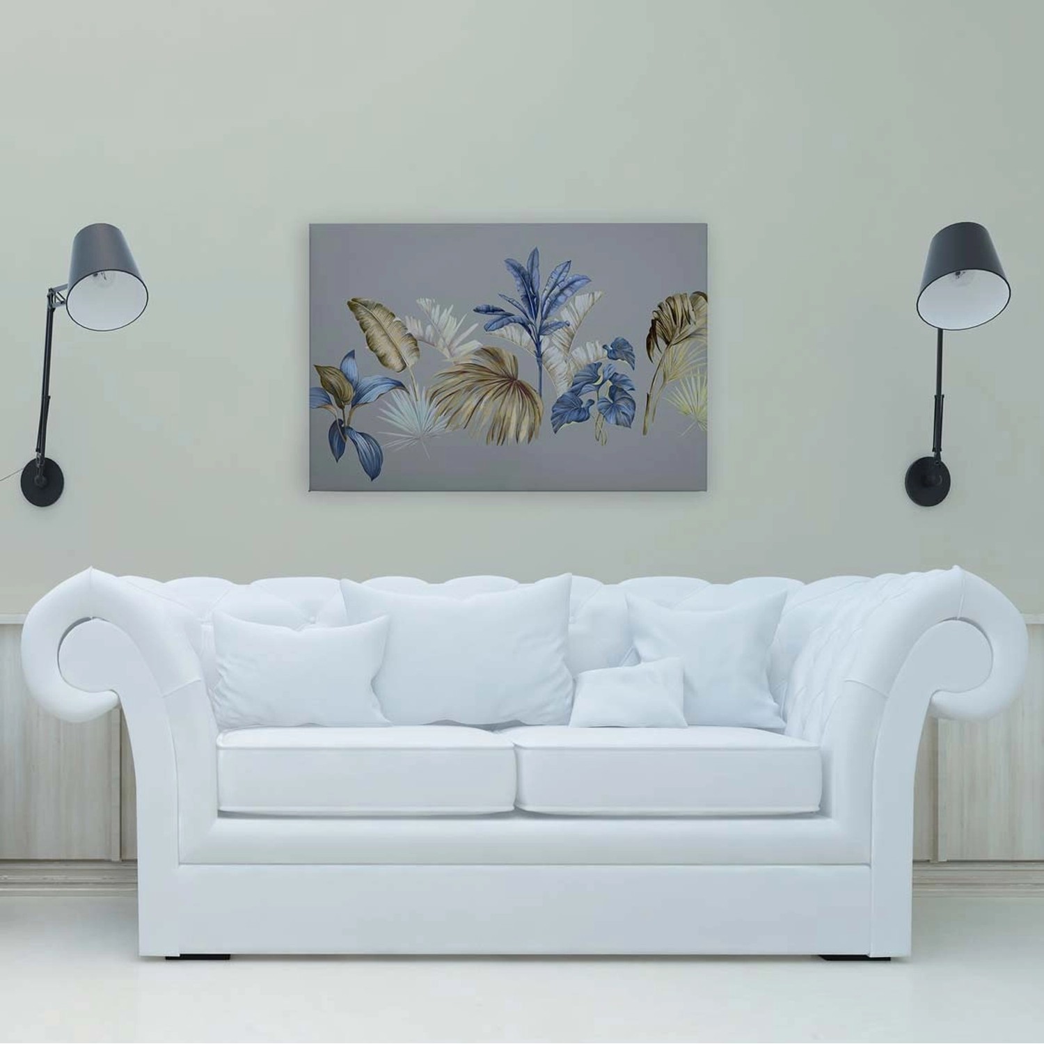 Die grafische Darstellung der Palmenblätter verleiht dem Bild eine moderne und zeitlose Ästhetik. Die sorgfältig ausgewählten Farben – ein sanftes Grau, ein beruhigendes Blau und ein edles Gold – harmonieren perfekt miteinander und erzeugen ein Gefühl von Harmonie und Ausgeglichenheit. Die Größe von 120 x 80 cm macht das Bild zu einem beeindruckenden Blickfang, ohne dabei aufdringlich zu wirken.
